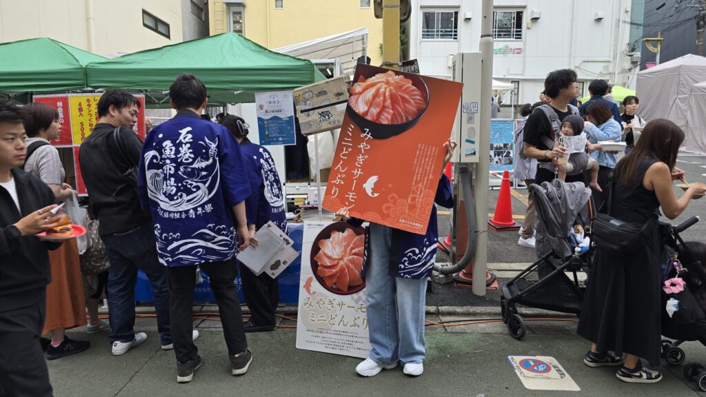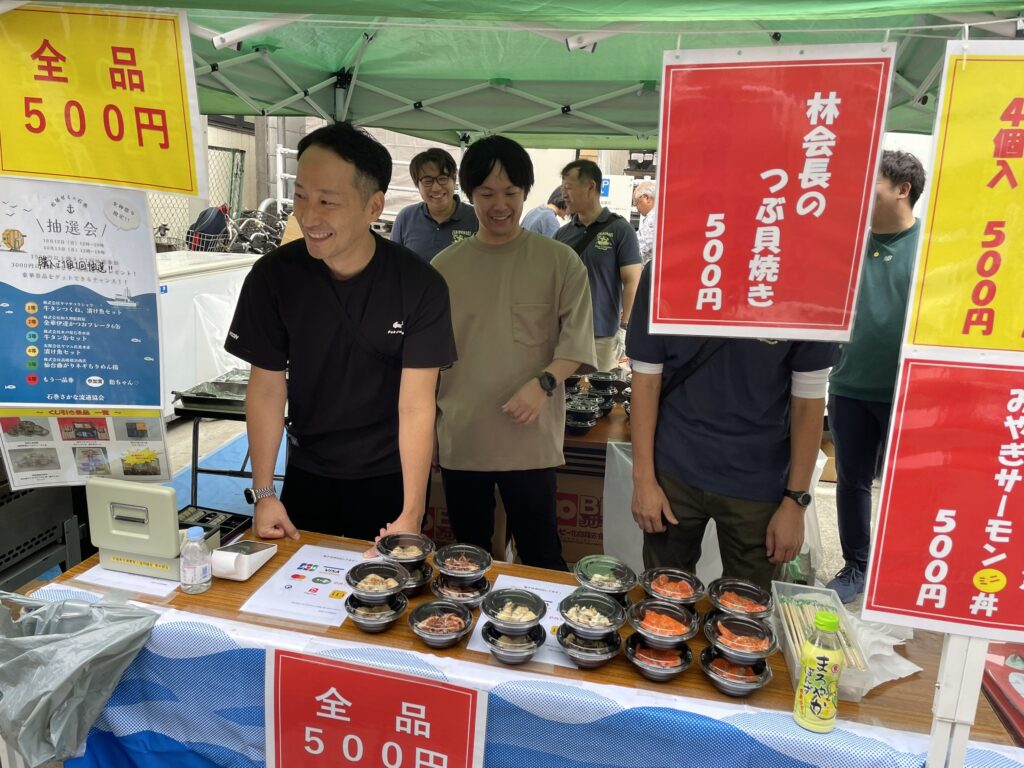 今回当協会では、「みやぎサーモンミニ丼」、「つぶ貝焼き」、「焼きカキ」、「牛タンつくねボール」、「イカゲソ焼き」の5種類を販売。みやぎサーモンミニ丼のみやぎサーモンは「みやぎ銀ざけ振興協議会」からのご協力を得て、販売いたしました。飲食ブース隣では産業能率大学松尾ゼミ生の力を借りまして、くじ引き大会を開催しました。くじ引き大会では石巻の豪華水産加工品を景品として準備いたしました。
